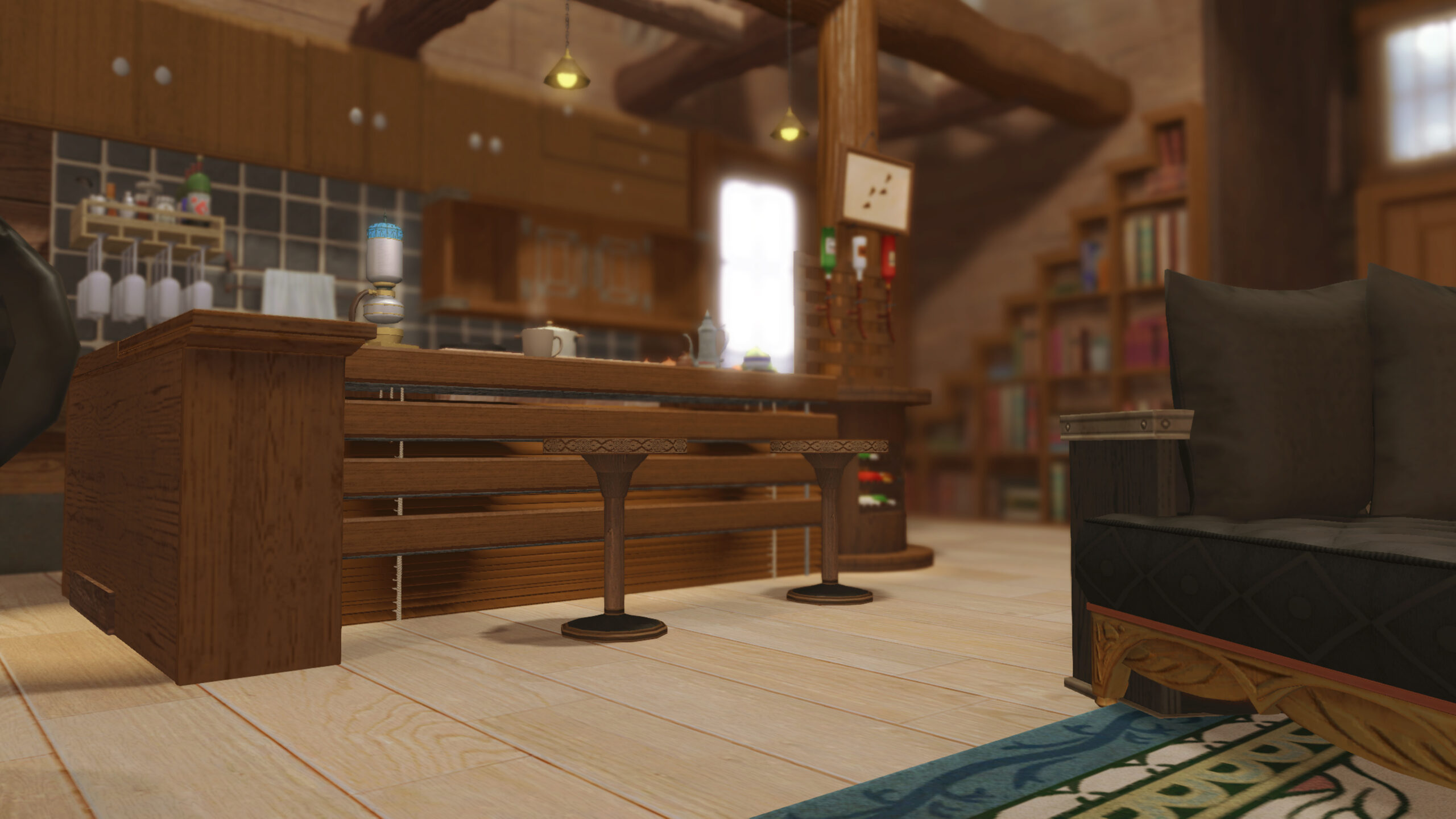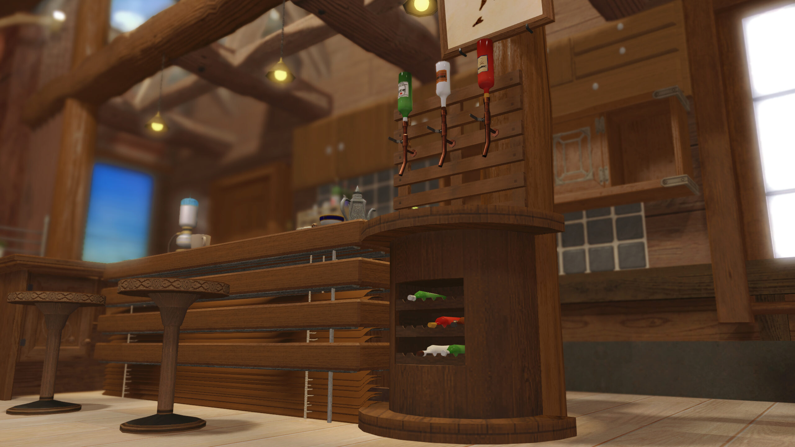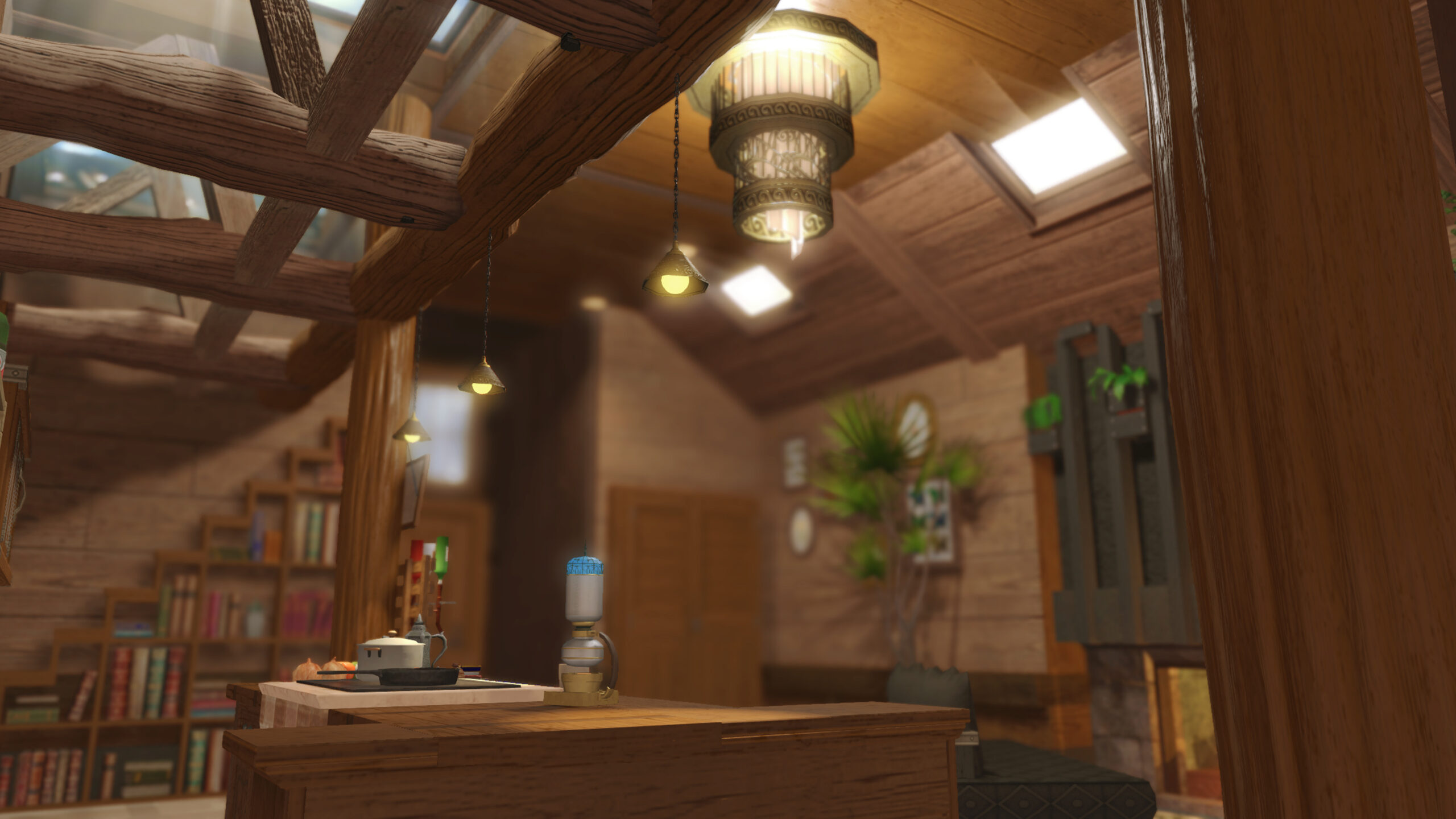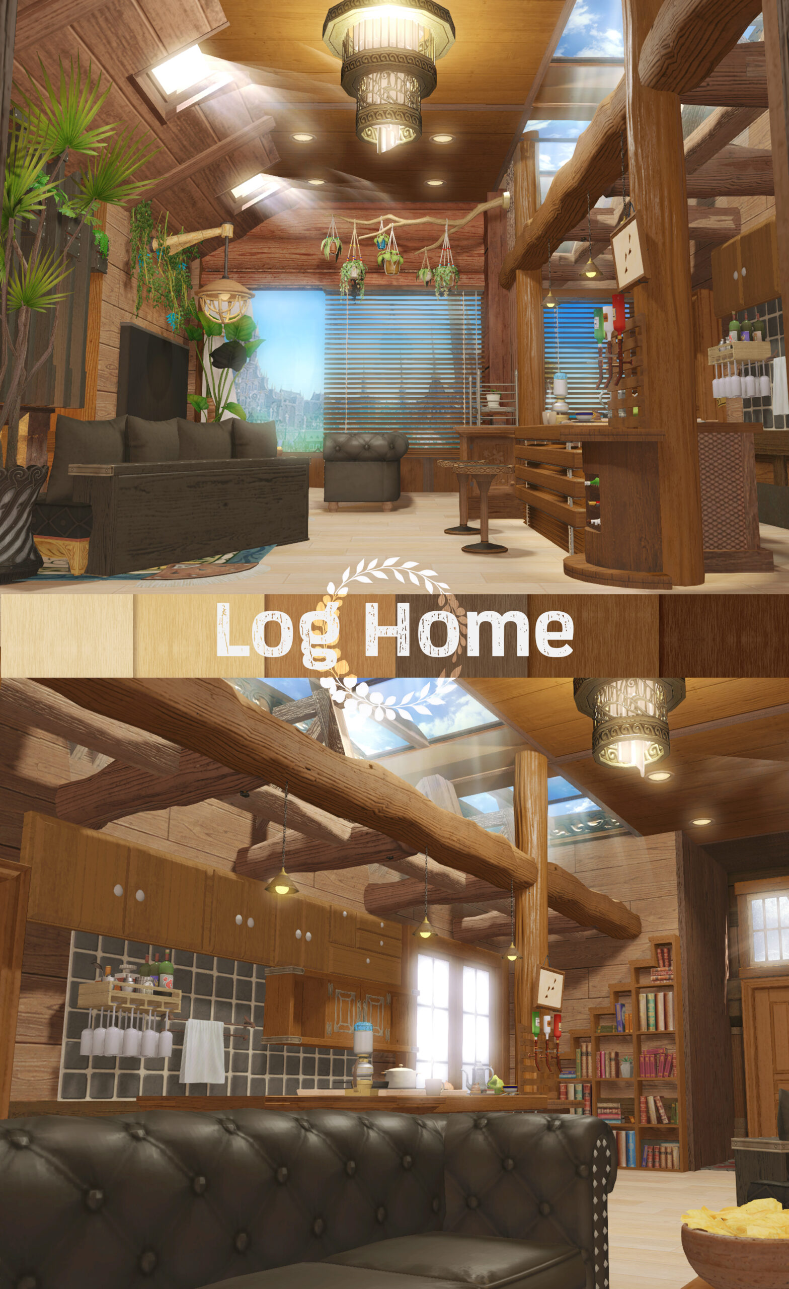 The interior features exposed log beams laid horizontally across the ceiling, creating a sense of rustic elegance,