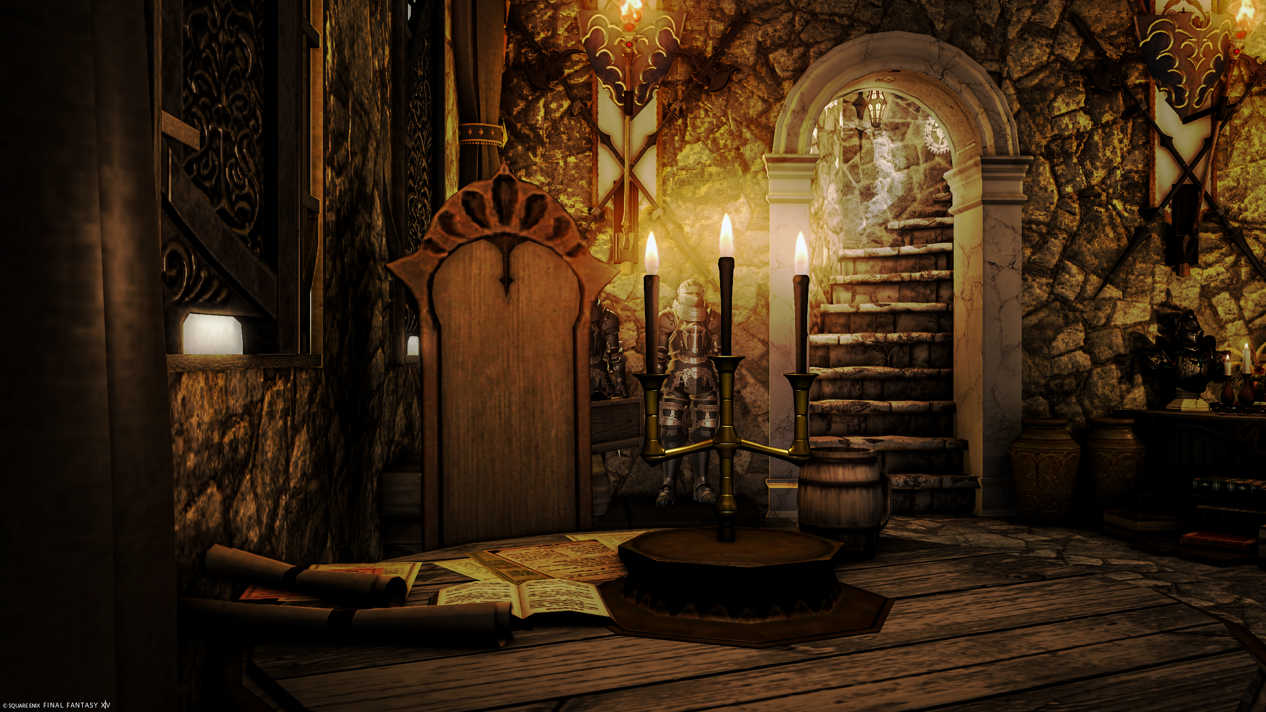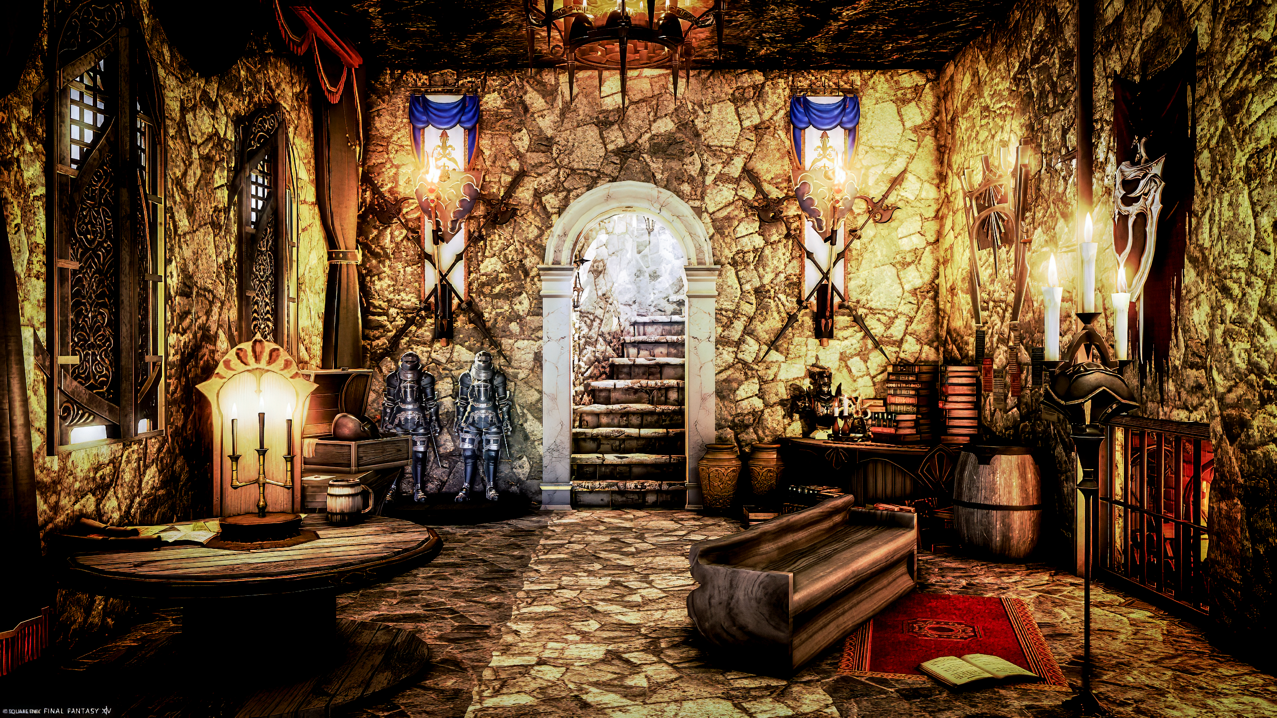 Knightrium by OREO(||BR||)🌐Mana / Chocobo(||BR||)📍ミスト・ヴィレッジ16区(||BR||)アパルトメント36号室(||BR||)騎士の私室をイメージしたスタジオを作ってみました(||BR||)中世ファンタジーに出てくるようなカッコいい鎧などでのSS撮影にぜひお越しくださいませ!(||BR||)*奥の階段は上段と下段に座れま(||BR||)#OreoStu(||BR||)https://studio-xiv.com/studio/93884/