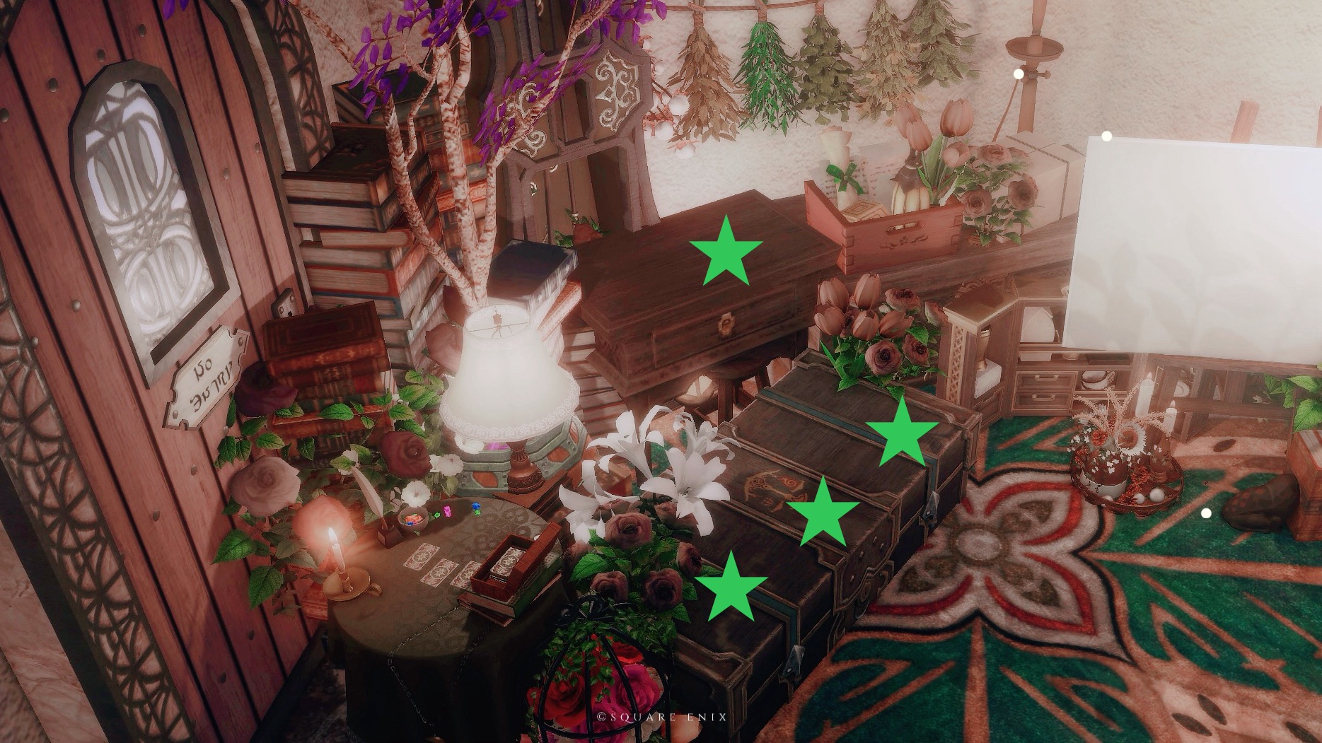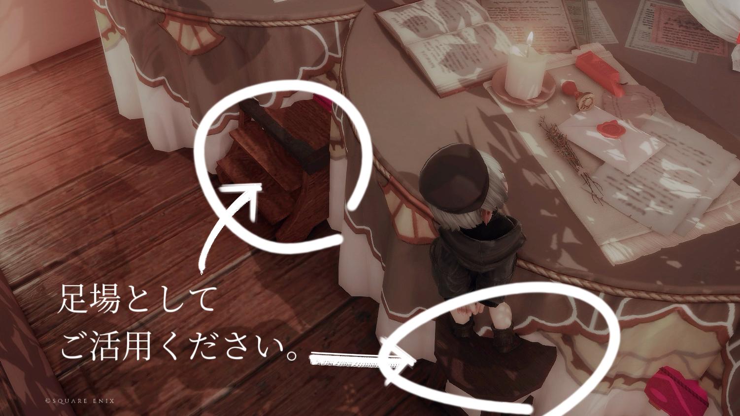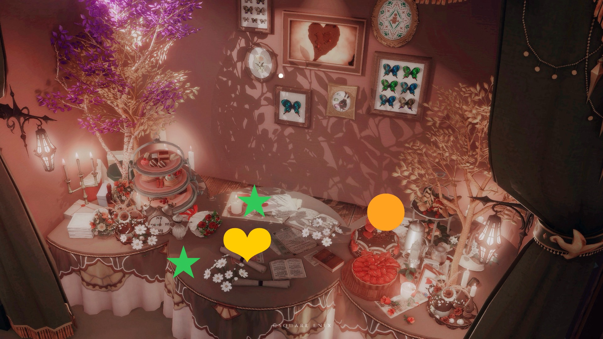 ※参考SSの緑の★は座ることができます。黄色の❤︎はエモート「居眠りをする」で横たわれます。オレンジの⚫︎の箇所にはステップを置いているので、ララちゃんはぜひ足場としてご利用ください。