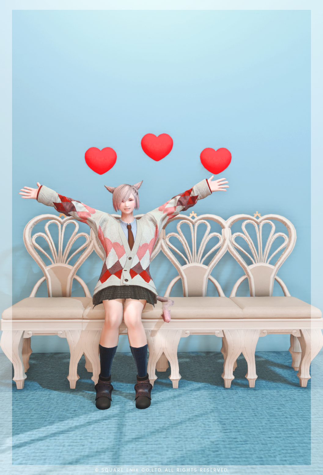 背景がピンクのブースは普通に座って撮影可能ですが椅子の上にそれぞれ立って向かい合わせになってから腰掛をすることで画像4枚目のような仲良し構図で撮影可能です(座った感じは画像5のようになるので上半身のみの撮影推奨)