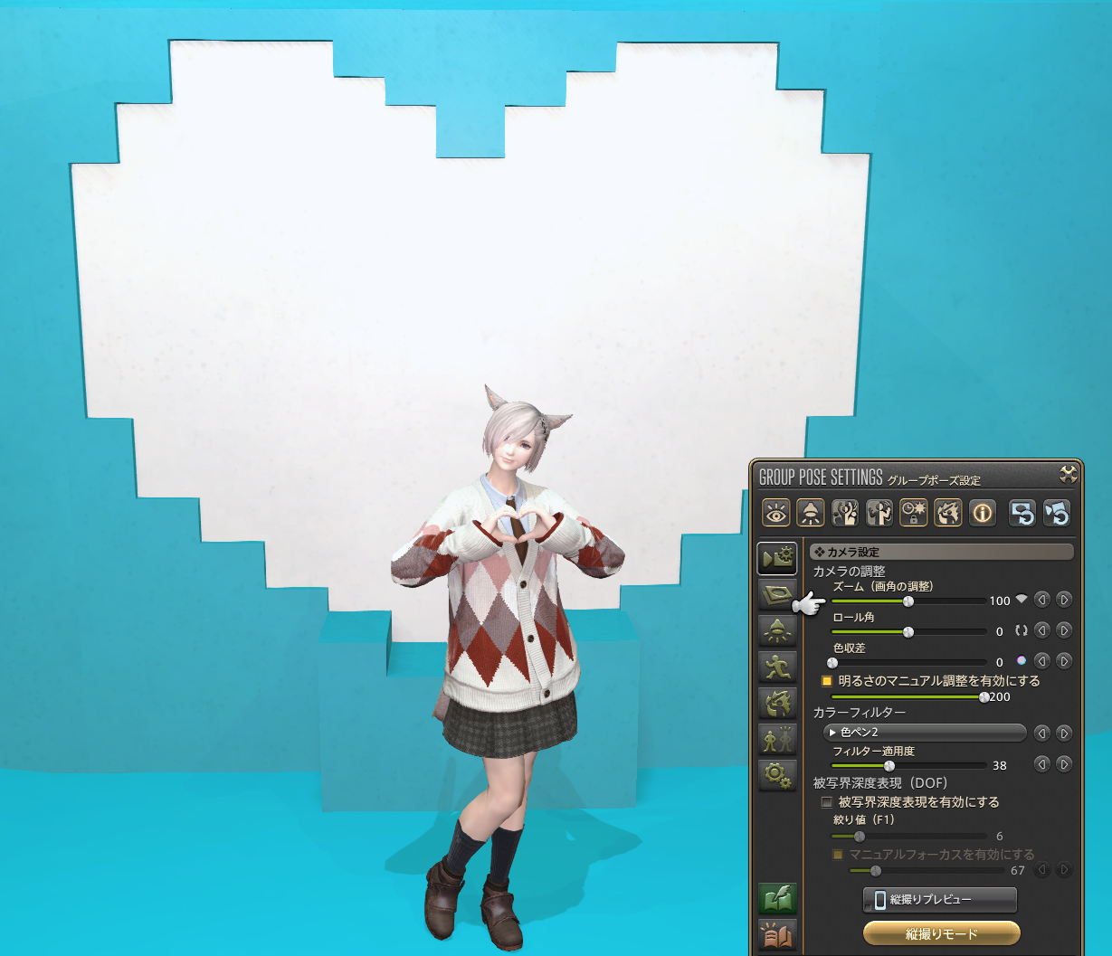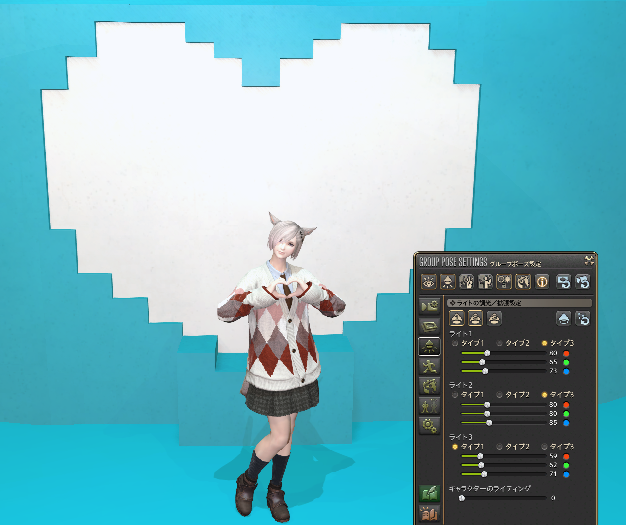 そのままのライト設定でも撮影できるように調整していますが、グループポーズの機能のみで撮影する場合の一例を画像6と7に出しています