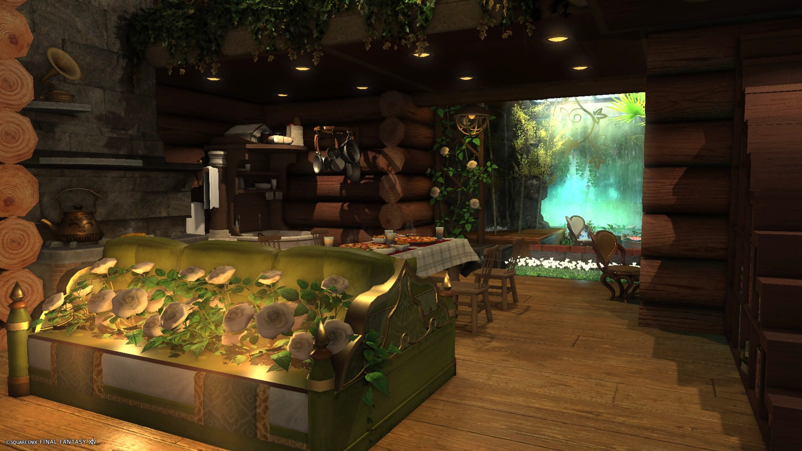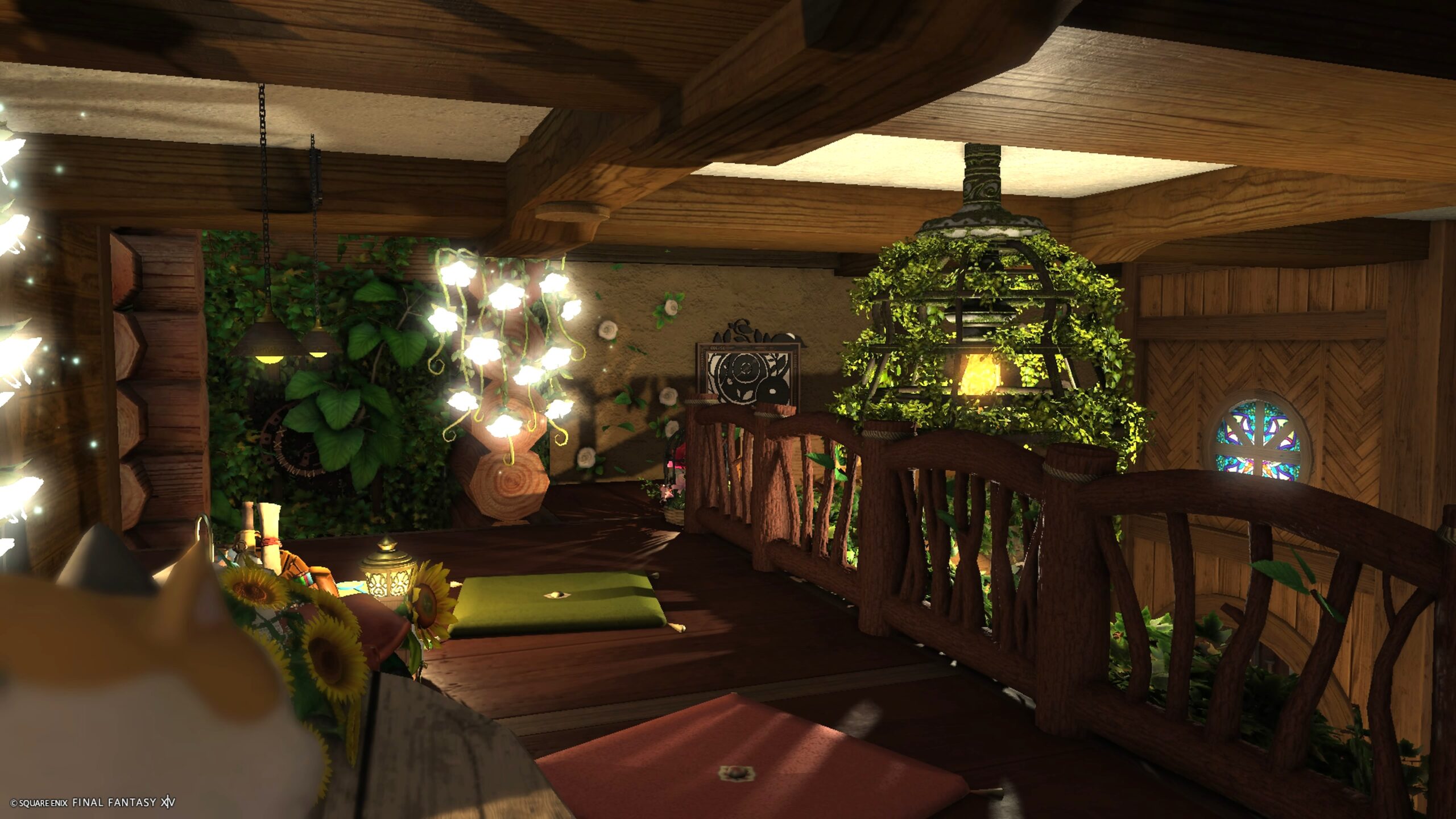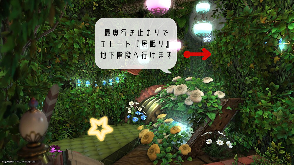 緑の小道最奥でエモート『居眠り』で隠れ家に続く階段へ進めます 小道にあるソファ(☆マーク)で寝たり座ったりできます