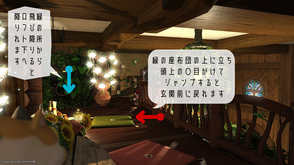 玄関へ戻る方法 ロフト上にある緑の座布団の上に立ち 頭上の〇目がけてジャンプしてください