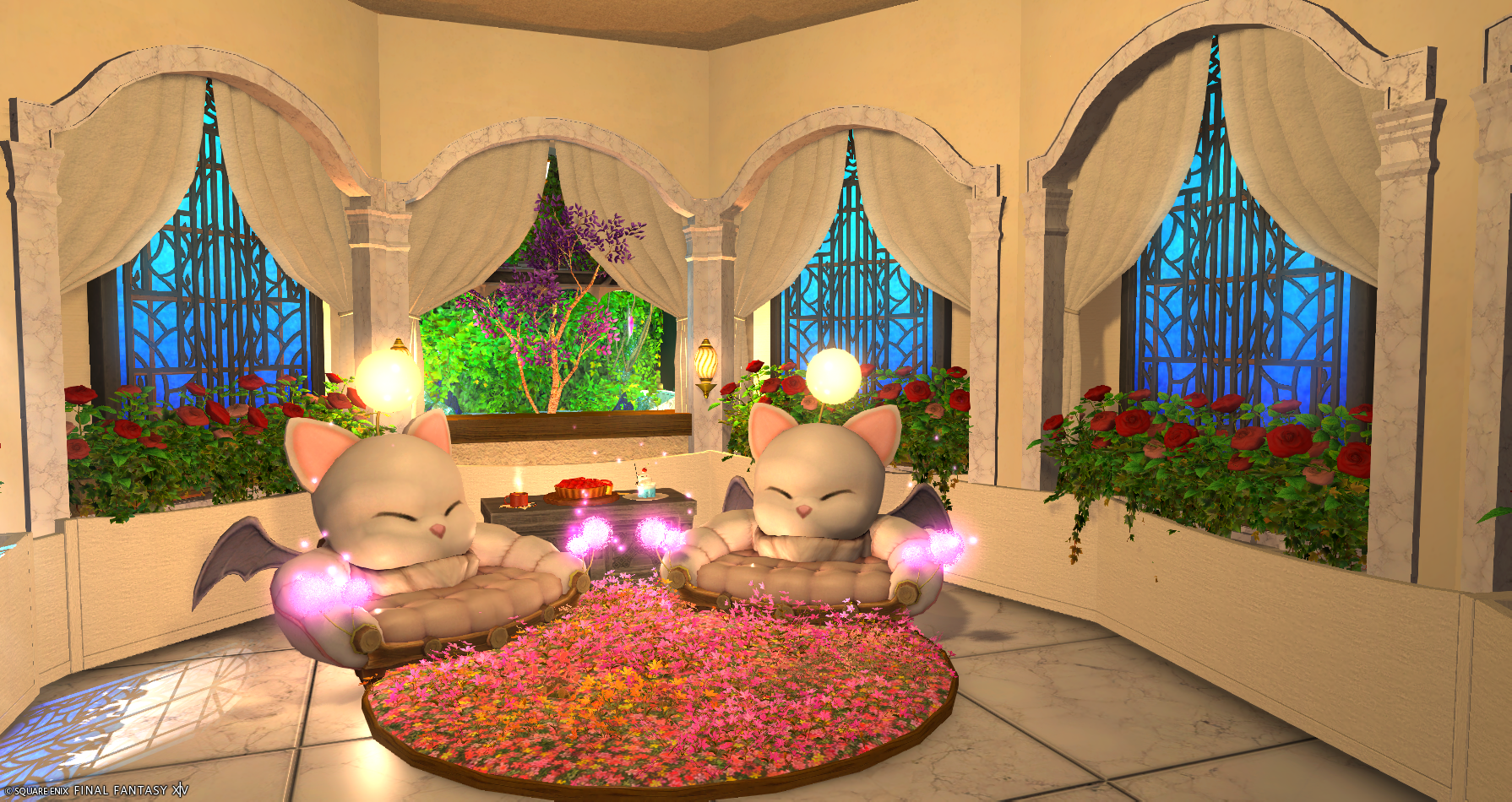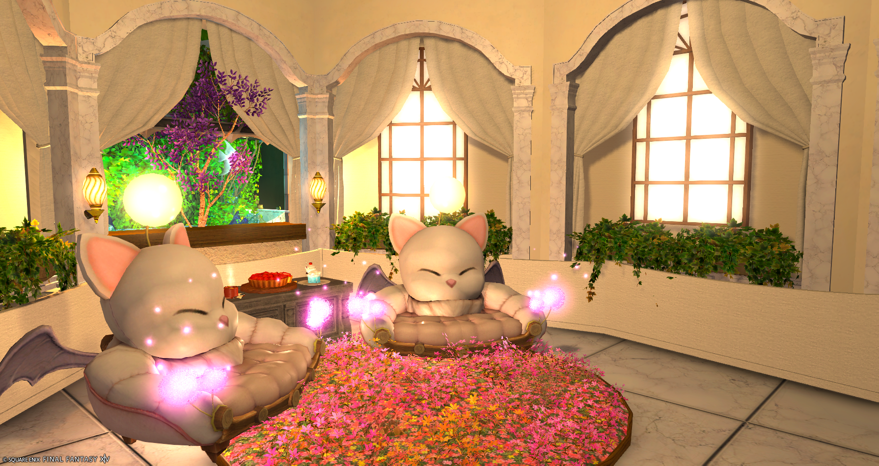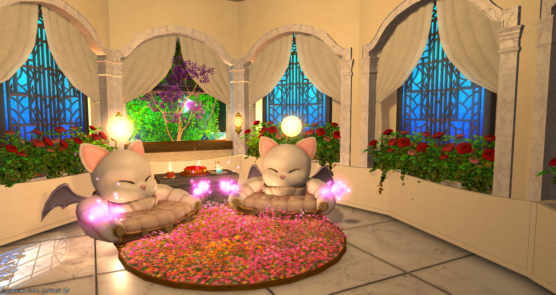 モーグリのソファーに座ると、お花とステンドグラスが出てくるギミック 部屋から出るとリセットされるので何回でも楽しめます 日の当たる時間帯は光が綺麗です