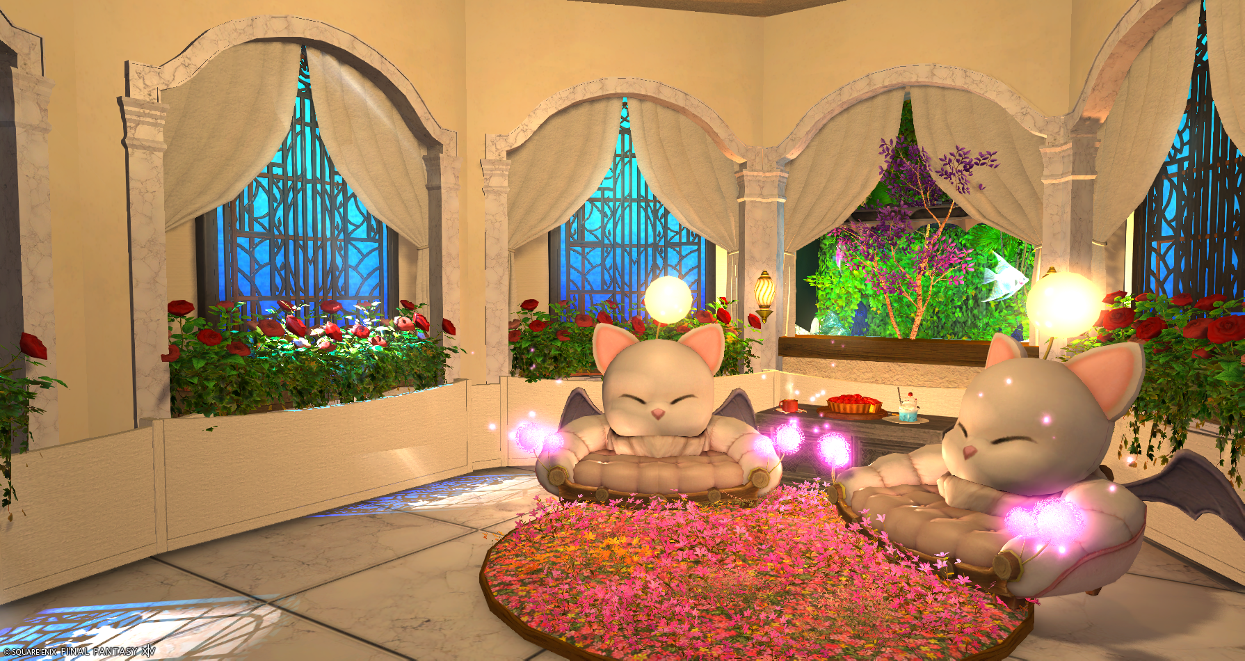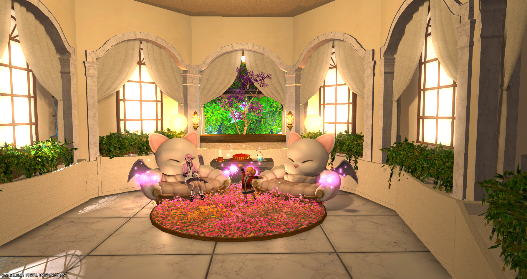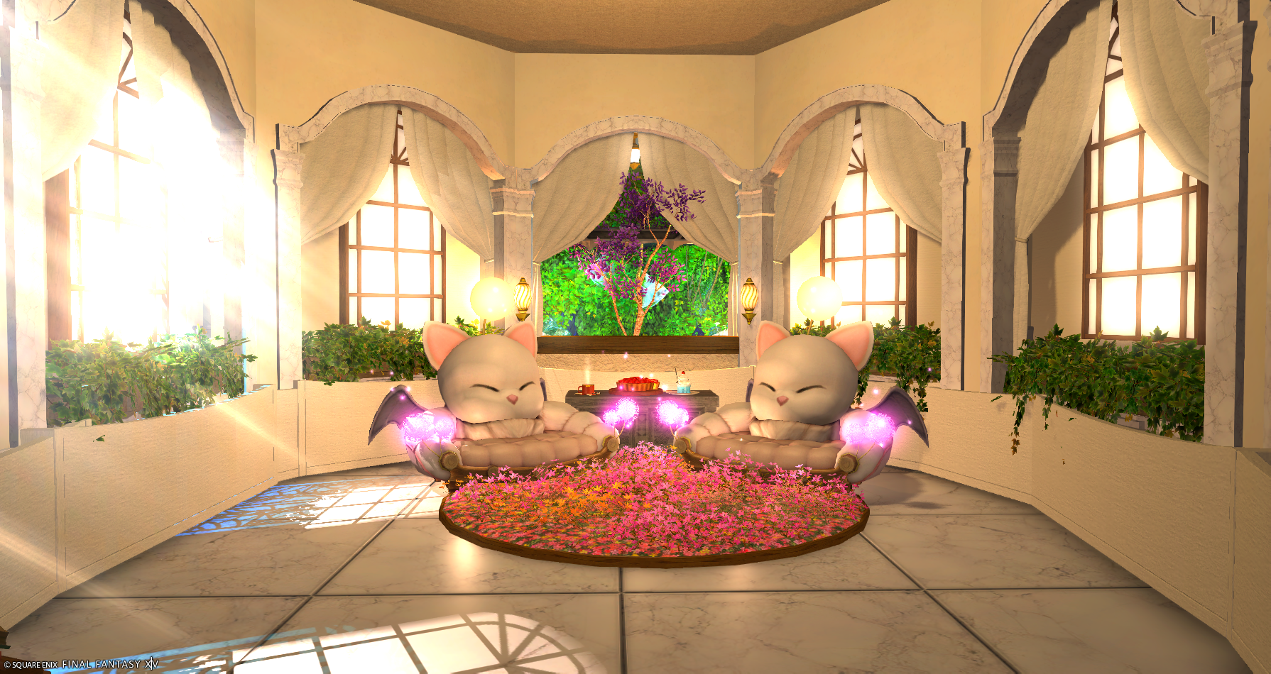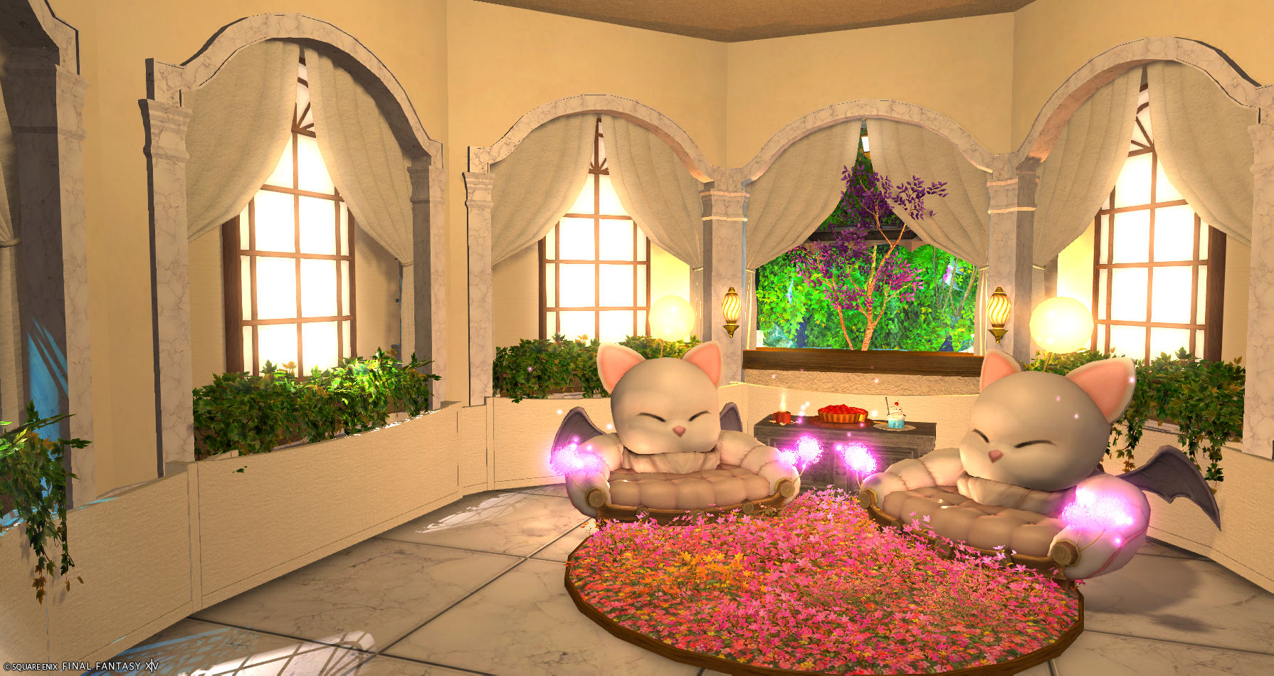 モーグリのソファーに座ると、お花とステンドグラスが出てくるギミック 部屋から出るとリセットされるので何回でも楽しめます 日の当たる時間帯は光が綺麗です