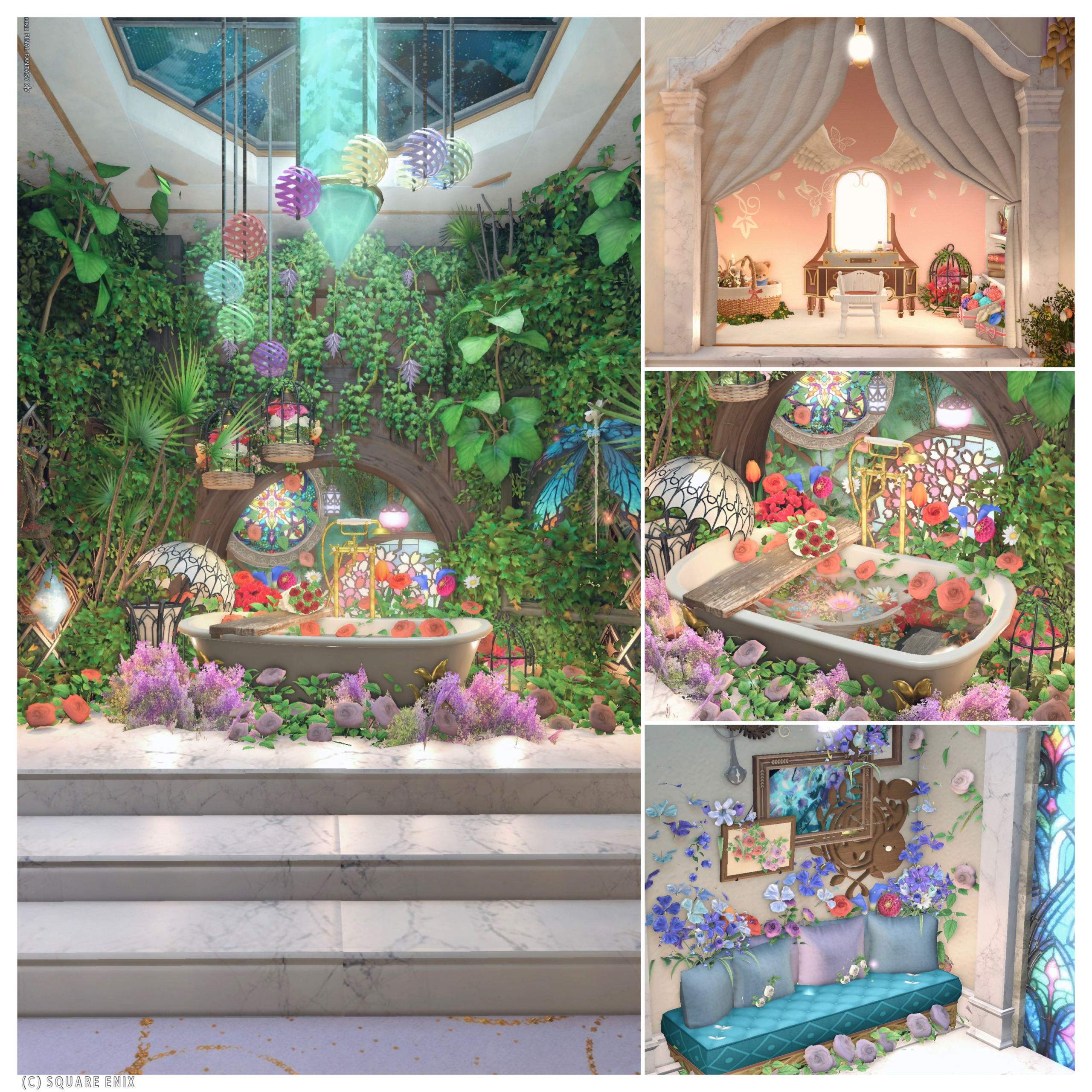 花密の夢雫 by シン(||BR||)🌐Elemental / Gungnir(||BR||)📍ラベンダーベッド29区9番(||BR||)花が密やかに咲き溢れるバスルームです。(||BR||)※ MOD使用禁止。(||BR||)※ 長時間の放置はご遠慮ください。(||BR||)#sughousing(||BR||)https://studio-xiv.com/studio/98245/